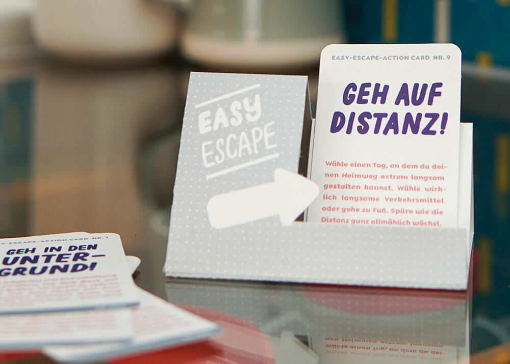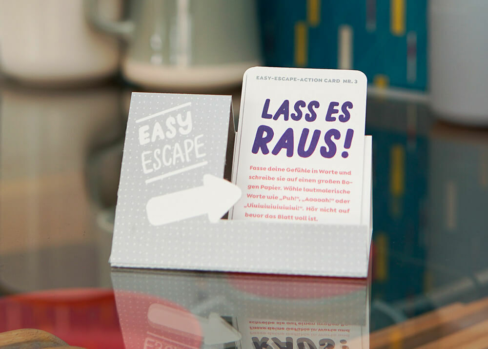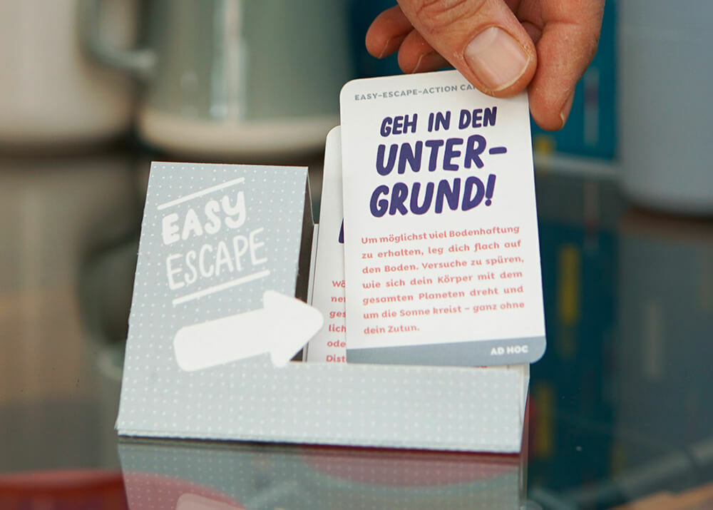 Die EASY-ESCAPE-ACTION CARDS offerieren dem Ruhebedürftigen Vorschläge für die Unterbrechung des Alltags. Statt sich von Hektik, Stress und Zeitdruck gefangen nehmen zu lassen, helfen die Aktionsideen sich ad hoc, geplant oder einfach zwischendurch etwas mehr Langsamkeit zu gönnen: Für etwas mehr Stille – da, wo du gerade bist.